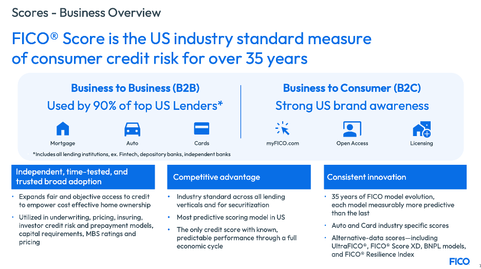 Scores is FICO’s core franchise and he standard measure of consumer risk in the U.S. It is used in most U.S. credit decisions, by nearly all major banks, credit card issuers, mortgage lenders, and auto loan originators.