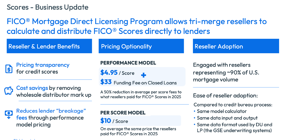 FICO raised their pricing to $10 per score, BUT offered the option to the resellers to go direct and only pay $4.95 per score plus a $33 success fee per borrower.