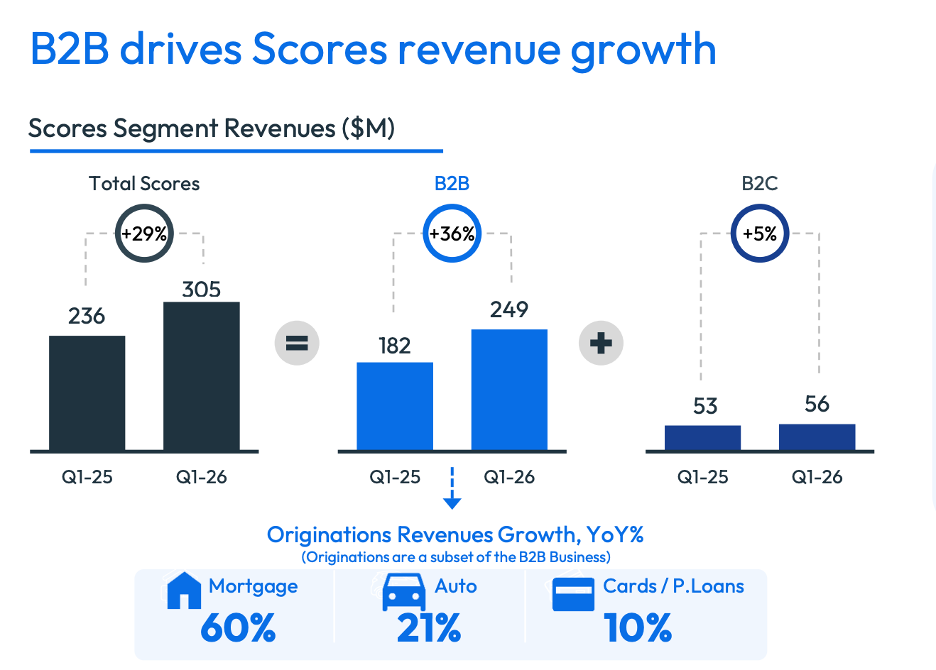 These B2B revenues are the majority of the scoring business too, at around 82% of the total Scores segment. The rest of the B2B segment includes credit cards, auto loans, and personal loans.
