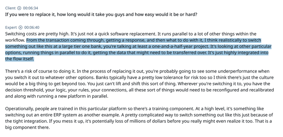 The risk there is obvious: if a competitor builds a better fraud product, a bank can rip out Falcon without replacing everything else.