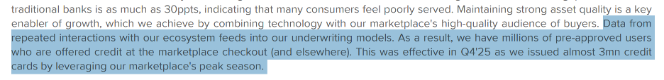 Since they have data on consumers' purchases both from their Mercado Libre marketplace as well as their network of merchants and users that use the Mercado Pago app, they can “pre-approve” consumers for credit cards.