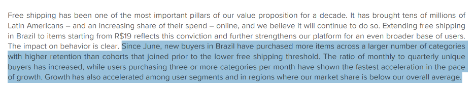 And Mercado has already noted they have seen reduction in shipping costs per unit from the volume increases, as well as increased purchase frequency, all of which suggest it could improve their competitive positioning and profitability longer term.
