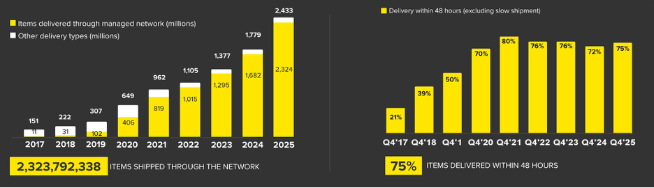 75% of items sold are delivered in under 48 hours. Which is more impressive than it might sound given how massive Latin America is and how less developed the logistics network was prior to Mercado Libre.