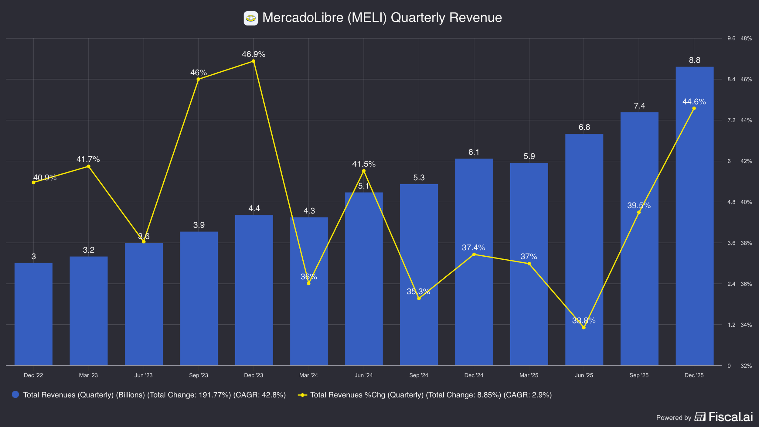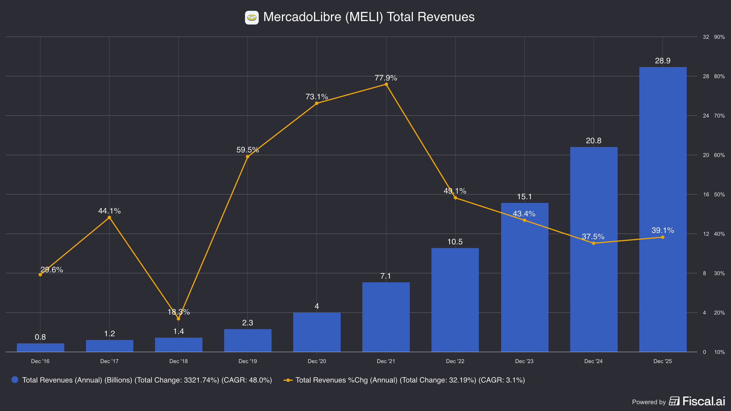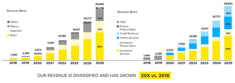 Mercado Libre has revenues of $28.8 billion, growing 39%. In 4Q they grew even faster at 45% y/y.