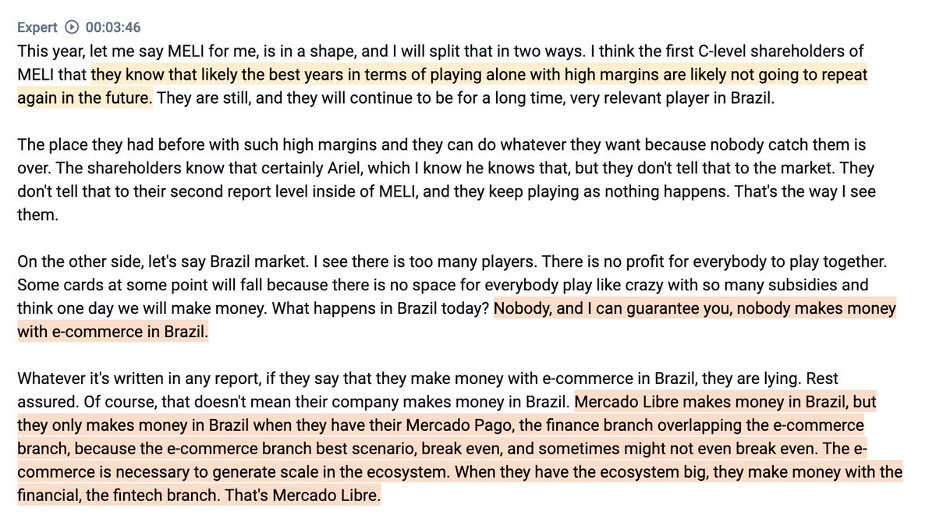 The more bearish read though is that they were forced to do this and competitive intensity will mean this is always a rough market. The former President of Brazil Shopee thought that no one in Brazil was making money on ecommerce and Mercado Libre might make money only with the financing arm.