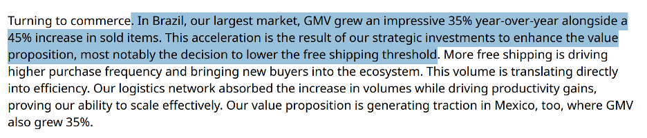 To address the Shopee threat though, they lowered their free delivery minimum to R$19. This resulted in 45% item sold growth and 35% GMV growth in Brazil.