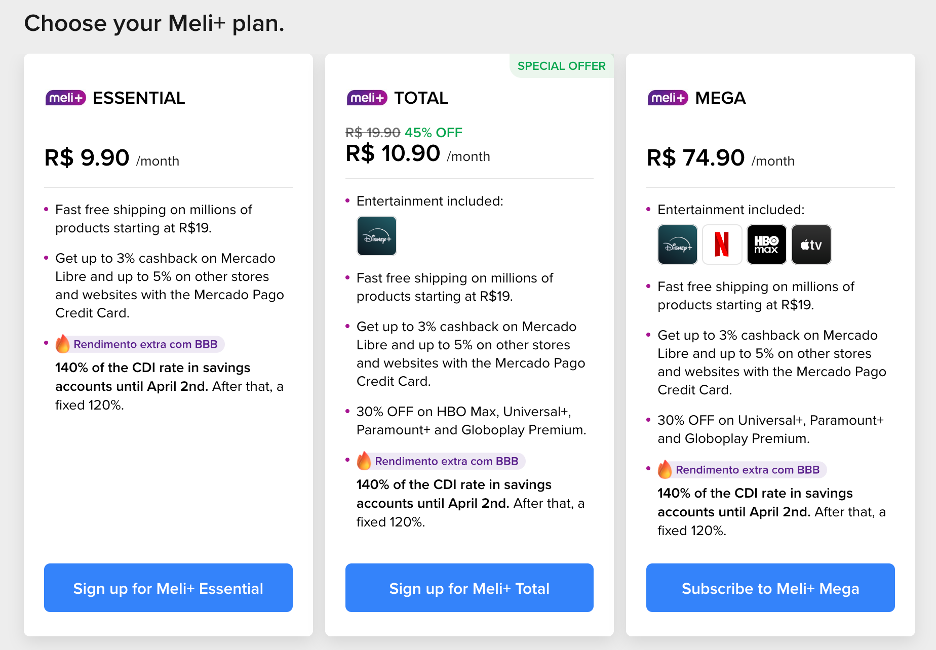 Similar to Amazon Prime, they have Meli+. However, they have 3 different plans.