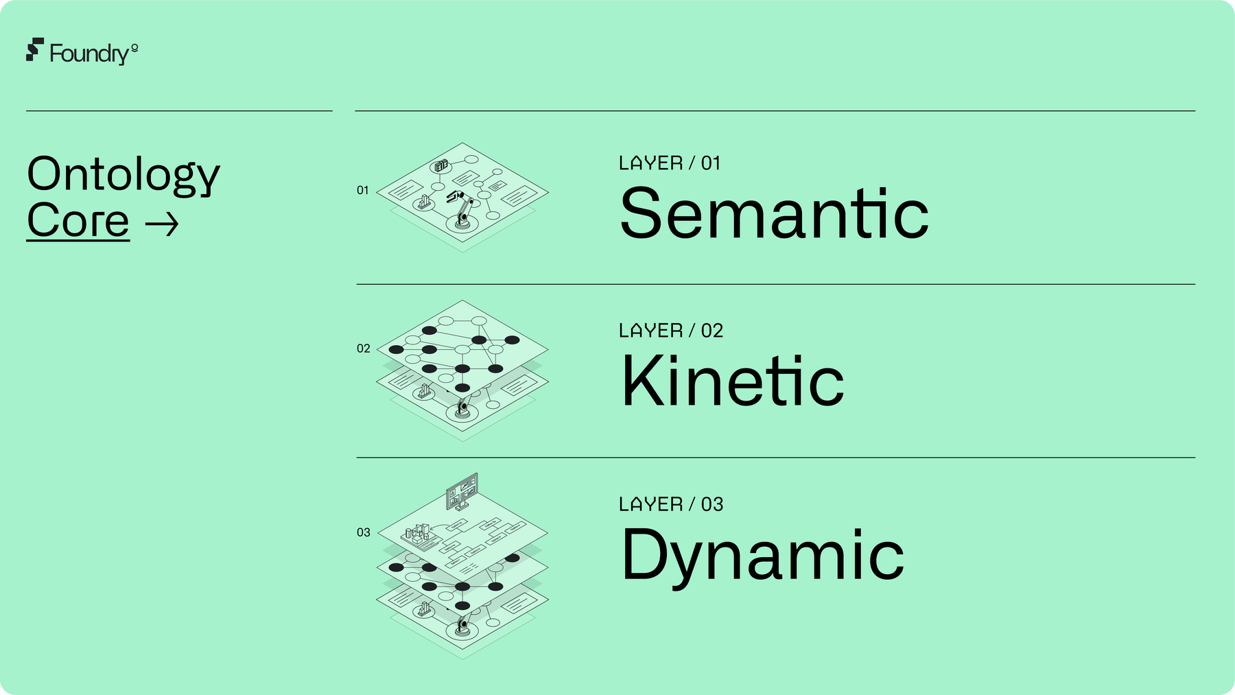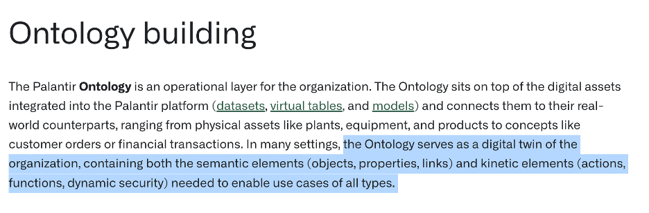 1) Semantic: This is the mapping of data. For example, there is a truck, it is at Warehouse A, and it is linked to Order 123. Palantir describes the semantic elements as objects, properties, and links.