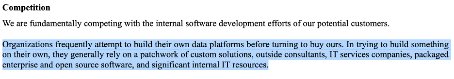 While the idea that AI created software will displace SaaS is a new risk, Palantir has been fighting enterprises trying to create their own in-house solutions for literally decades.