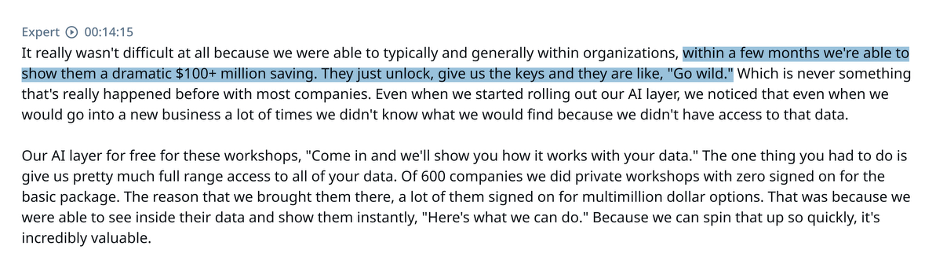 In this AlphaSense Expert call below, a former Palantir head of growth notes how once they were able to prove massive cost saving (+$100 million) they were gaining access to all of a business’s data, which helps increase the contract size and scope.