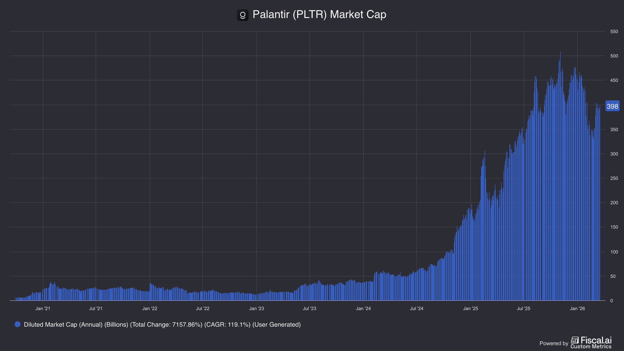 At a stock price of ~$155, Palantir has a fully diluted market cap of $398 billion. (We were using undiluted market cap in the intro).