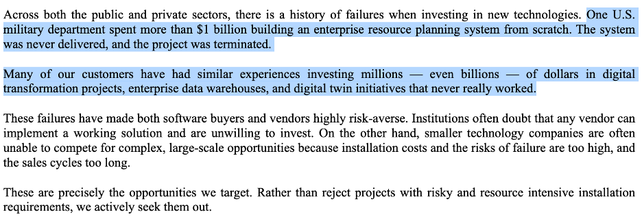 But it is also worth mentioning that the more complex (and old) an organization’s data architecture is, the more they gain from Palantir.