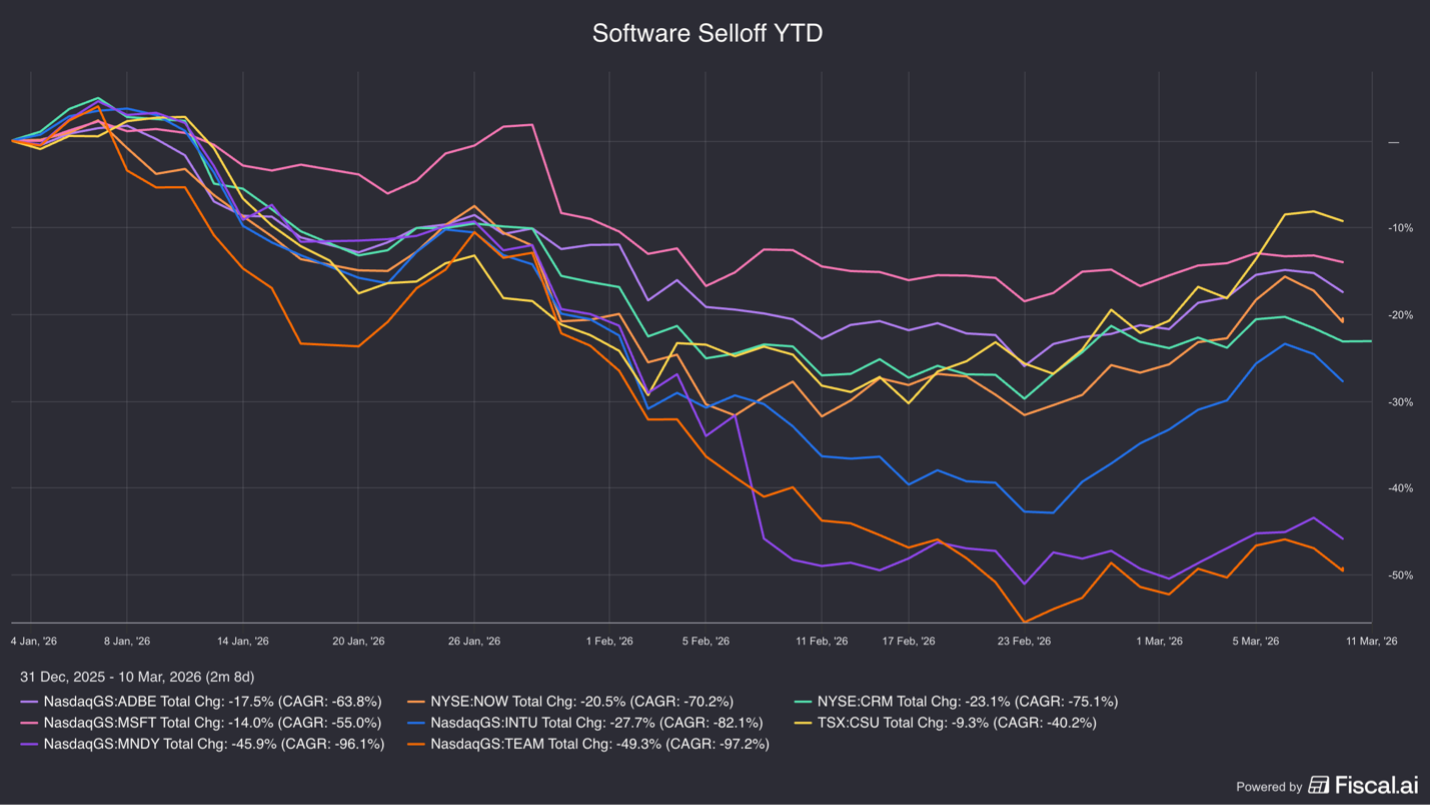 Many publicly traded software companies have experienced sharp drawdowns, with several stocks declining more than 50% from their peaks—one of the sector’s steepest corrections since the market sell off during Covid in 2020.