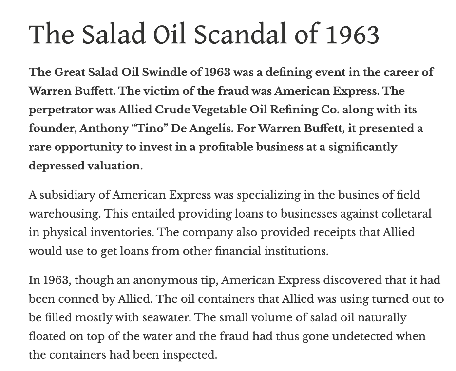A similar dynamic existed in Buffett’s investment in American Express during the “Salad Oil Scandal.”