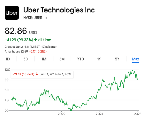 With a stock price of $82 and a market cap of $170 billion, Uber trades at 47x earnings.