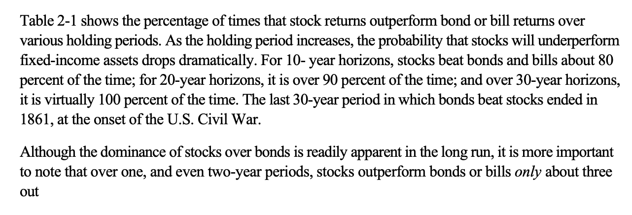 Then on a 30 year period, stocks have outperformed bonds 100% of the time.