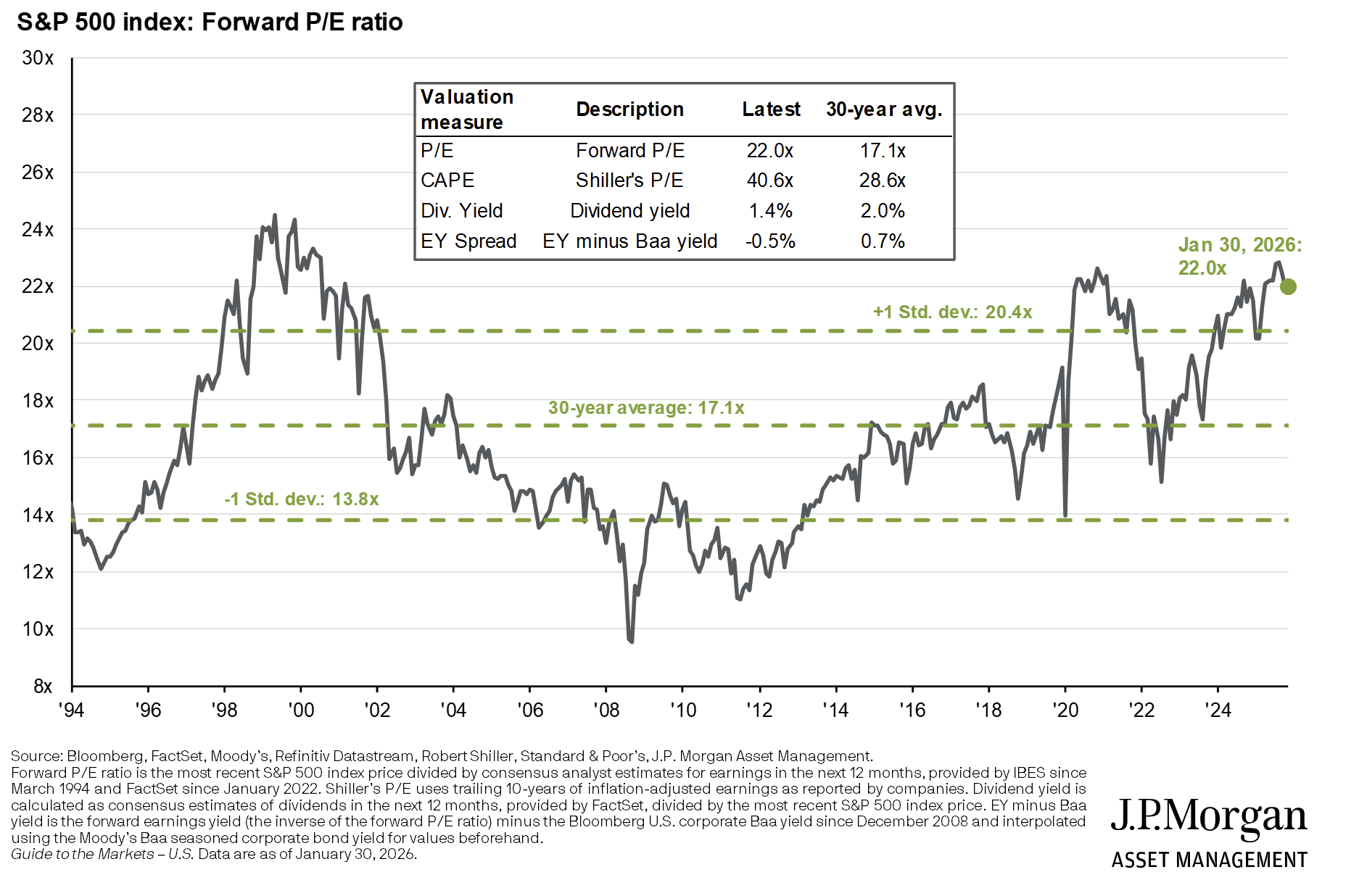 While markets tend to spend most of the time near all time highs, valuations right now are 2 standard deviations from the historical norm of ~17x P/E.