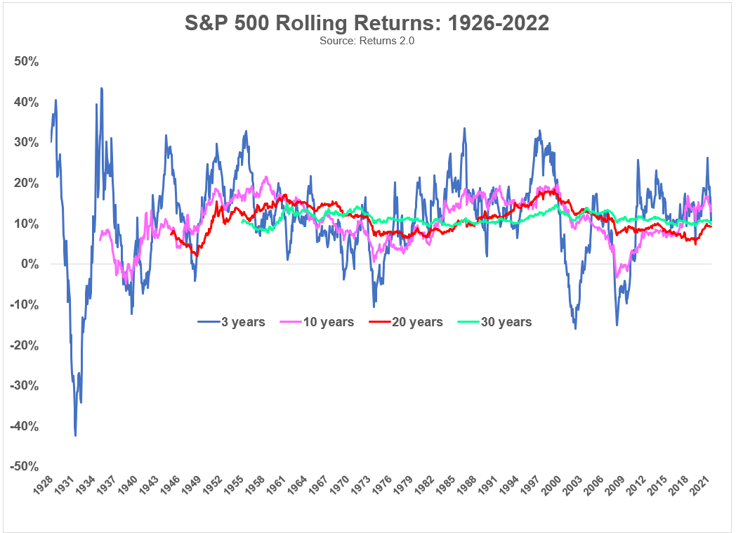 Again drawing on Jeremy Siegel’s work, there’s been no 15 year period where stocks have not fully recovered, and no 20 year period where stocks have not been positive in real return.